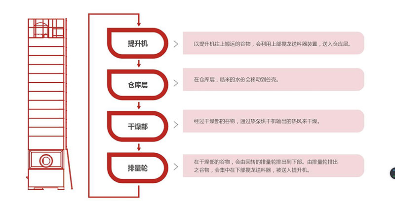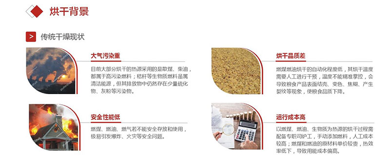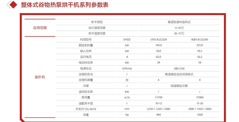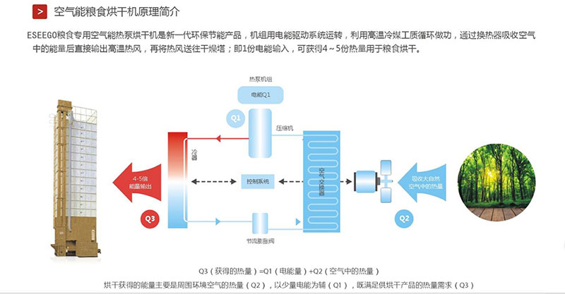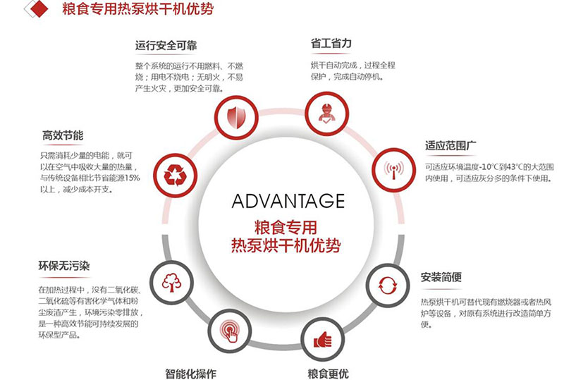 整体式谷物热泵烘干机:谷物热泵烘干机采用热风烘干箱,采用旋转加温装置,短时间内可产生大量热风,通过高温处理可达到杀虫的目的,彻底解决烘干过程中出现的变色现象,烘干箱体采用金属铝内壁、硅胶棉保温、波纹彩钢板或铝合金外壁。箱内采用数字化控制与检测,实现空气的循环与湿化,加热温度得到有效控制。